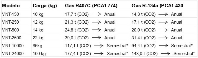 (*) Nota importante: Si el equipo supera las 50 tCO_2eq (como ocurre en los modelos VNT-10000 y superiores), el control de fugas es cada 6 meses. Si tuviera instalado un sistema de detección automática, pasaría a ser anual.